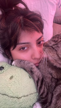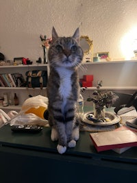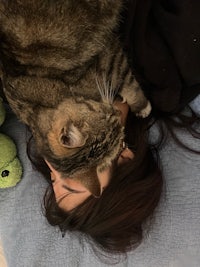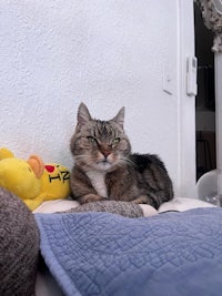 this is her with pancho. pancho hates other cats but he tolerated her, they never cuddled but they laid across from each other at a very safe and comfortable distance. they were besties